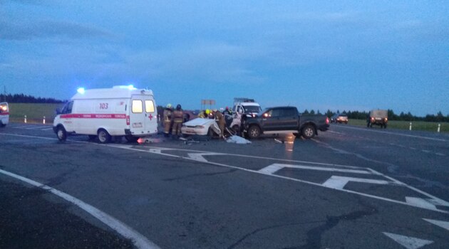 Два человека погибли после столкновения трех автомобилей на трассе в Удмуртии