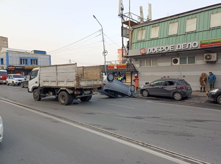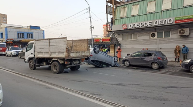 Иномарка легла на крышу после жесткого ДТП с грузовиком во Владивостоке