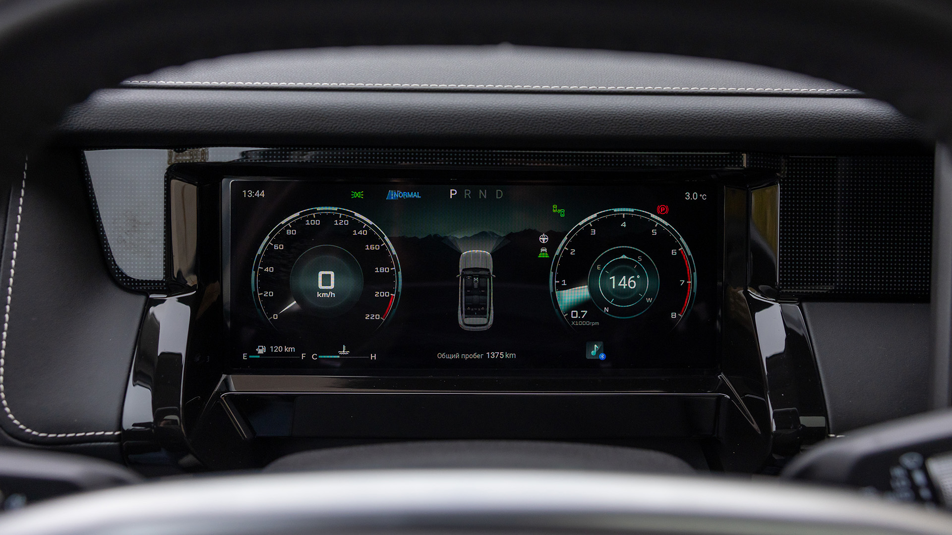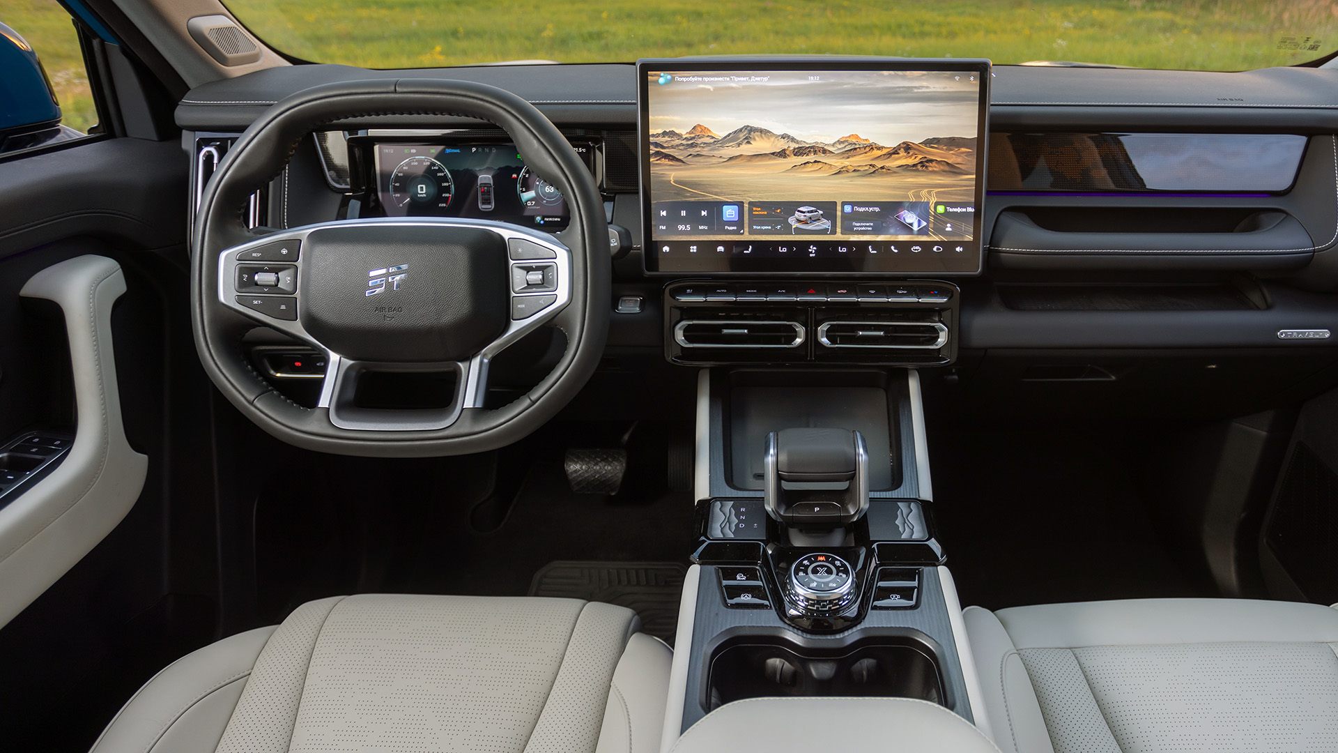 Внутри Т1 оформлен так же, как и старший Т2, с той лишь разницей, что здесь чуть меньше чисто внедорожных фишек вроде дополнительных ручек на стойках и дверях. Хотя одна на передней панели перед пассажиром всё же имеется. Ну и огромный тачскрин мультимедийной системы и цветная цифровая приборка никуда не делись, куда ж без них. При этом у Т1 есть физические клавиши под нижней кромкой «мультимедийки», которые отвечают за управление климат-контролем.