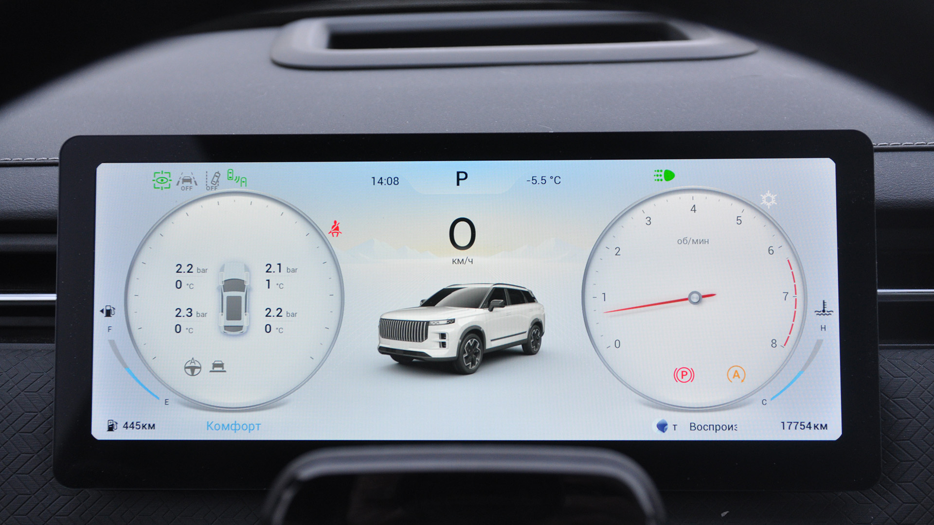Неоднозначное впечатление оставила цифровая приборная панель. Из двух тем оформления (классическая с круглыми шкалами или альтернативная со скоростью по центру) более-менее информативной показалась светлая «классика».
