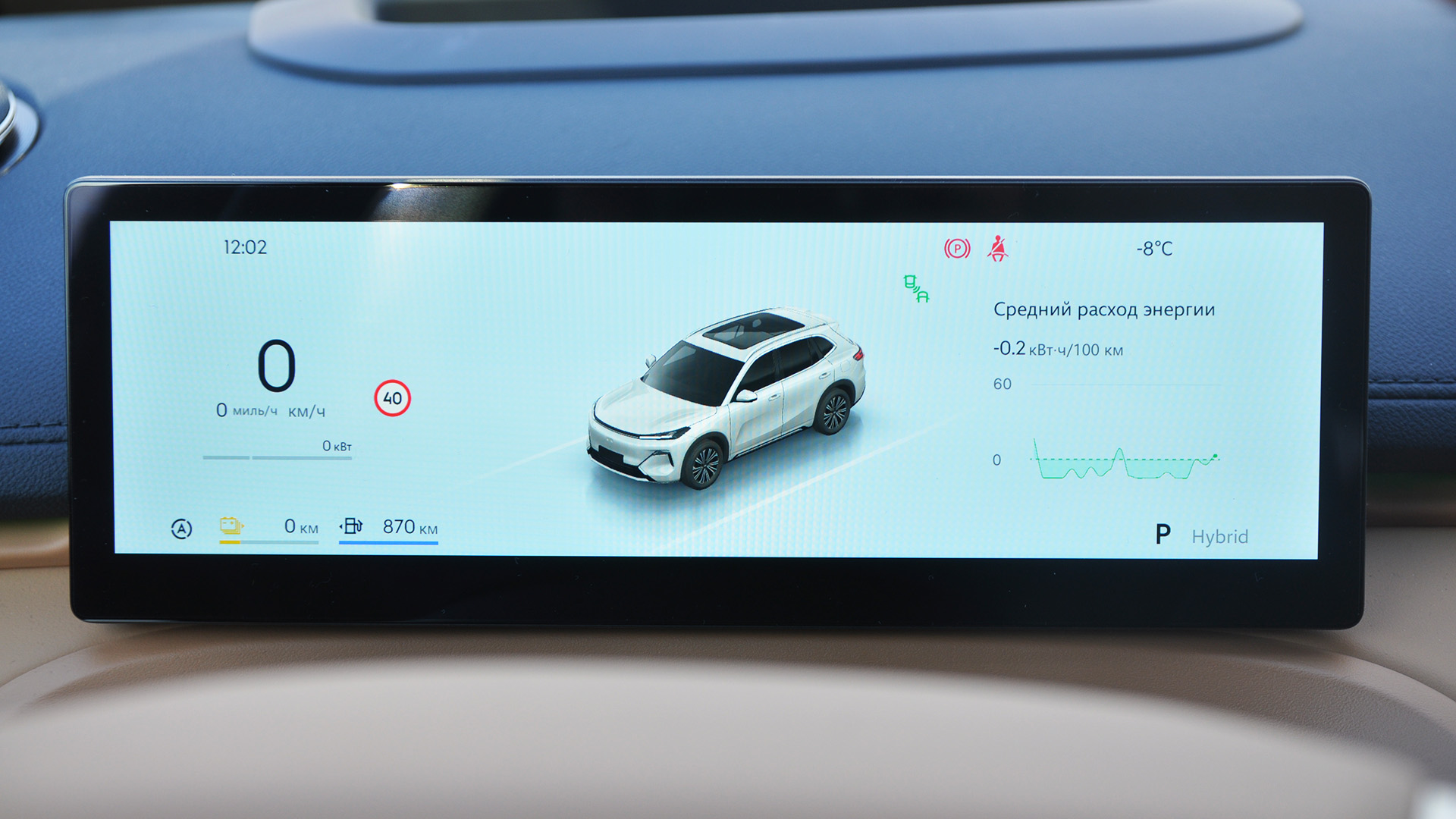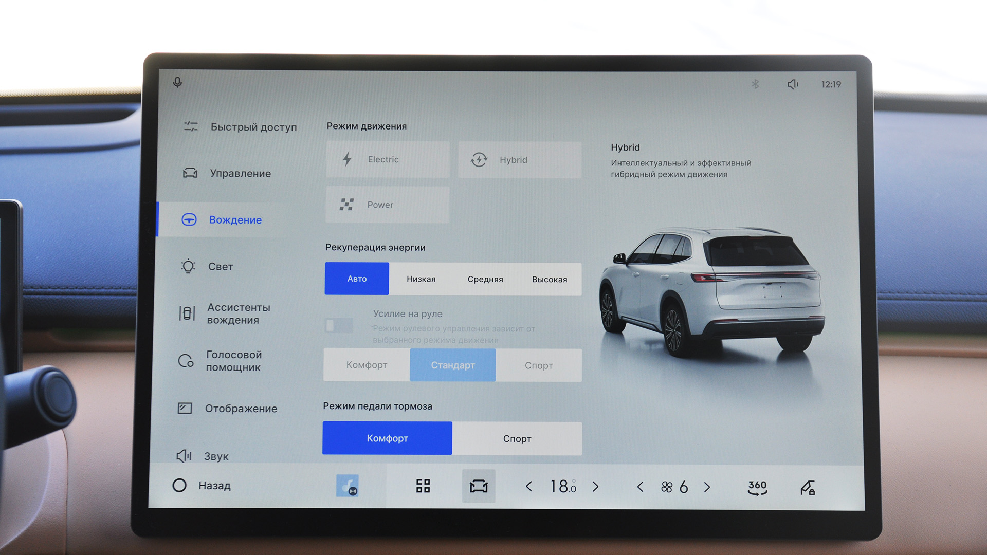 Мультимедийная система радует сочной графикой и быстрыми откликами. Меню многослойное, но логичное, так что разобраться в функциях несложно. Отдельно порадовало наличие физических кнопок на центральном тоннеле для регулировки температуры и доступа к детальным настройкам климата — это позволяет меньше отвлекаться от дороги. В разделе «Энергия» можно контролировать расход и запас хода, что для гибрида особенно полезно.