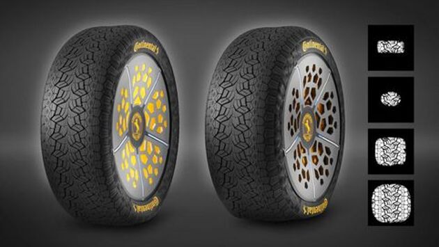 Немецкая компания Continental на моторшоу во Франкфурте представила «умные» шины, которые подстраиваются под дорожные условия. Пока это лишь концепт, но не исключено, что в будущем они могут появиться на автономных электрических автомобилях. Шины оснастили двумя новыми технологиями. Одна из них называется ContiSense. Это особая токопроводящая резиновая смесь с интегрированными сенсорами, которые постоянно анализируют глубину протектора и температуру шины. В случае отклонения полученные данных от нормы, система уведомляет об этом водителя. Также система может определять повреждение шины и уведомлять об этом до того, как давление упадет до минимума. В будущем компания планирует расширить функциональность ContiSense — ее научат определять температуру дороги и наличие на ней, например, снега. Вторая технология, примененная в шине называется ContiAdapt. Это встроенный в шину микрокомпрессор, который меняет давление и пятно контакта в зависимости от условий. Система работает в трех режимах: скользкая дорога, мокрая дорога, неровная дорога и стандартном. При движении, например, по сухой дороге, ContiAdapt уменьшает пятно контакта, улучшая тем самым экономичность. При движении по скользкой дороге или снегу система увеличивает пятно контакта или уменьшает давление в шине. Обе технологии Continental использовала при создании новой концептуальной шины, протектор которой разделен на три зоны. В зависимости от давления и ширины покрышки, зоны протектора активируются и шина адаптируется к дорожным условиям или предпочтениям водителя. В 2016 году на Женевском автосалоне компания Goodyear представила шины сферической формы. Концепт получил название Eagle-360. По задумке разработчиков, инновационные шины могли бы устанавливаться на беспилотники, а к автомобилю крепиться с помощью магнитной левитации.