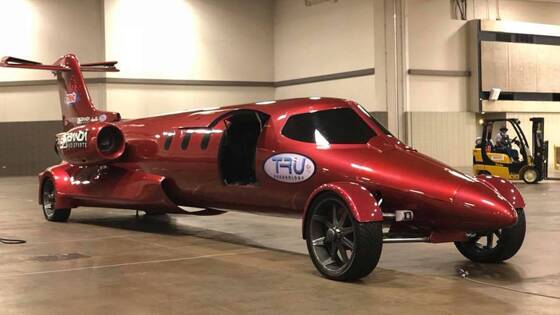 В мире автомобилей регулярно появляются удивительные произведения рук талантливых мастеров, но, сколько бы ни прошло времени, все равно несколько раз в год находятся экземпляры, которые по-настоящему удивляют и заставляют взглянуть на индустрию тюнинга с новой стороны. Мы не раз видели, как на автомобили устанавливают реактивные двигатели, но мы никогда не видели, как самолет превращается в автомобиль. Познакомьтесь с Limo-Jet. Этот агрегат создан компанией Jetsetter из Иллинойса и несколько дней назад он был представлен публике в Далласе на выставке мобильной электроники KnowledgeFest. Идея возникла еще в 2006 году у Дэна Харриса и Френка ДиАнджело, с тех пор прошло уже немеряно времени, и проект был завершен совсем недавно. Причем этот четырехколесный самолет имеет право ездить по дорогам общего пользования. Это не просто самолет с четырьмя колесами, а настоящий лимузин с кучей сидений, подсветкой и музыкой - все, что нужно для настоящей развеселой свадьбы. Спереди - одно место для пилота, точнее - водителя, с кучей мониторов, которые, судя по всему, помогают ему контролировать этот не совсем габаритный автомобиль. Для входа и выхода используется только одна боковая дверь - все же дух частного самолета сохранен. Снаружи фюзеляж окрашен в красный металлик, а в корпуса двигателей встроена подсветка, чтобы ночью это смотрелось как можно более эффектнее. Поскольку использование настоящих реактивных двигателей помешало бы разрешению для дорог общего пользования, в движение автомобиль приводится двигателем V8 пока неизвестного происхождения.