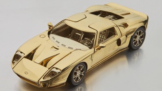 Спорткар Ford GT первого поколения выпускался с 2003 по 2006 гг.; всего было выпущено чуть более 4 000 машин. Автомобиль разрабатывался в качестве концепта к столетию Ford, однако положительные отзывы о прототипе побудили компанию выпустить серийную модель. Дизайн Ford GT, как известно, проектировался на основе гоночного Ford GT40 1960 года. На аукционе «Сотбис» выставили на продажу миниатюрную модель автомобиля Ford GT образца 2006 года, которая сделана из двухцветного 18-каратного золота; сообщается, что машинку сделали по заказу одного из родственников Генри Форда. У модели крутятся колеса, а также открываются двигательный отсек, багажник и двери. Как указано на сайте аукционного дома, начальная ставка составляет 24 000 долларов, а до конца торгов остается три дня.