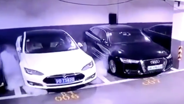 В китайской соцсети Weibo появился ролик с самопроизвольно загоревшейся на парковке Tesla Model S. На видео видно, как из-под автомобиля сначала идет дым, потом лифтбек взрывается и начинает гореть.