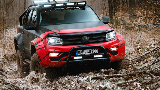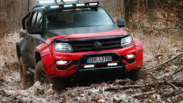 Немецкое тюнинг-ателье Delta4x4 подготовило экстремальный вариант пикапа Volkswagen Amarok. Автомобиль стал на 200 миллиметров шире, а его высота увеличилась на 250 миллиметров (до 2154 и 2084 миллиметров соответственно). Пикап получил 10-сантиметровый «лифт», а также набор внедорожных пружин и амортизаторов Bilstein, которые делают автомобиль выше еще на четыре сантиметра. Кроме того, «Амарок» оснастили 20-дюймовыми дисками из алюминиевого сплава и 35-дюймовыми «зубастыми» покрышками Cooper. За счет них высота машины увеличится еще на 10 сантиметров. Также для машины можно заказать комплект шин 33-дюймовых шин Yokohama, который обойдется в 4500 евро (вместе с дисками) или почти 325 тысяч рублей по текущему курсу. Дополнительно новинка имеет массивные расширители колесных арок, силовой бампер с дополнительным освещением, светодиодную «люстру» и черно-красную матовую окраску кузова. Информации о технической начинке тюнингованного варианта нет. В России модель доступна с дизельными моторами мощностью 140, 180 и 224 силы. Самый доступный вариант стоит от 2,4 миллиона рублей, а топовый – 3,9 миллиона рублей. В сумме доработки Delta4x4 обойдутся в 8,3 тысячи евро (600 тысяч рублей).