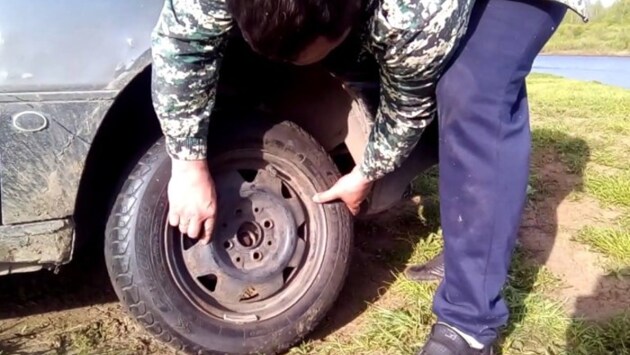 После этого, зафиксировав, чтобы не скатилась с импровизированной подставки, машину «ручником», нужно подложить под её порог ещё один обломок валежника или что-то подобное, при необходимости вырыв под ним углубление, если размер бревна слишком большой. Теперь можно убрать подставку из-под колеса и, окончательно открутив болты, снять его.