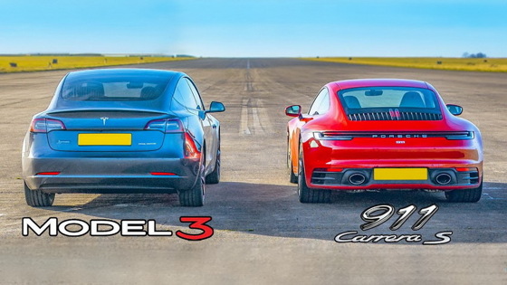 YouTube-канал carwow сопоставил разгонную и тормозную динамику Tesla Model 3 в топ-версии Performance с Porsche 911 Carrera S в кузове 992. Полноприводный американский седан и заднеприводное немецкое купе в нескольких режимах проехали дрэг-гонку на дистанции 402 метров и сразились в стартах с хода. Видео: Audi RS5 и Mercedes-AMG GLC 63 S сразились в дрэге с Tesla Model 3 Новый Porsche 911 Carrera S в кузове 992 приводит в движение оппозитная «битурбошестёрка» объёмом 3,0 литра мощностью 450 лошадиных сил (530 Нм крутящего момента). Силовой агрегат сочетается с преселективным «роботом» PDK с восемью передачами. С места до 96 километров в час «девятьсот одиннадцатый» разгоняется за 3,5 секунды. Масса — всего 1515 килограммов. Цена в Великобритании — около 93 тысяч фунтов стерлингов (7 миллионов 456 тысяч рублей по актуальному курсу). У Tesla Model 3 Performance два электромотора, и это самая дорогая версия бюджетного седана. Tesla намного дешевле Porsche: электрокар оценивается в 53 тысячи фунтов стерлингов (около 4 миллионов 250 тысяч рублей). Силовая установка выдаёт 490 лошадиных сил и 660 Нм крутящего момента. По паспортному разгону до 96 миль в час Model 3 выигрывает у немецкого купе 0,3 секунды, однако снаряжённая масса электромобиля — 1847 килограммов. Видео: carwow «Тесла» как мерило Tesla Model 3 подчёркнуто нейтральна к спорту: у электромобиля в версии Performance нет деталей, подчёркивающих завидную динамику. Однако это не помешало «Тесле» на равных биться с Porsche 911. Самой большой неожиданностью дуэли стал результат теста на эффективность торможения со 113 километров в час. Перевернуть игру