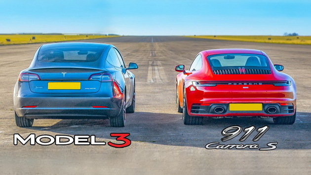 Видео: новый Porsche 911 бросает вызов Tesla Model 3 в дрэге