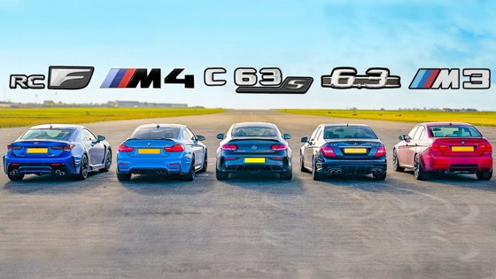 YouTube-канал carwow сопоставил разгонную и тормозную динамику заднеприводных моделей — «трекового» Lexus RC-F, актуальной BMW M4 и Mercedes-AMG C 63 S Coupe. Для наглядности в дрэге приняли участия прошлые поколения «немцев» в кузове седан — BMW M3 E90 и Mercedes-Benz C 63 AMG в кузове W204. Видео: кто победит в перетягивании каната, Mercedes-AMG G 63, Bentley Bentayga или Porsche Cayenne? BMW M4 оснащается рядной 3,0-литровой 431-сильной (550 Нм) «турбошестёркой», весит 1645 килограммов и стоит в Великобритании 66,5 тысяч фунтов стерлингов. Mercedes-AMG C 63 S приводит в движение наддувная «восьмёрка» объёмом 4,0 литра мощностью 510 лошадиных сил и крутящим моментом 700 Нм. Купе весит 1820 килограммов и стоит в Соединённом Королевстве 77,7 тысячи фунтов стерлингов. Под капотом Lexus RC-F атмосферный V8 5.0 мощностью 477 сил и крутящим моментом 530 Нм. Масса японского спорткара в облегчённой версии Track Edition — 1765 килограммов, цена — 60 тысяч фунтов стерлингов. BMW M4 F82 Mercedes-AMG C 63 S С205 Lexus RC-F Mercedes-Benz C 63 AMG W204 BMW M3 E90 Седан Mercedes-Benz C 63 AMG предыдущего поколения комплектуется 6,2-литровым «атмосферником» мощностью 457 сил (600 Нм крутящего момента). Заднеприводный автомобиль весит 1655 килограммов и стоит на вторичном рынке около 19 тысяч фунтов стерлингов. Четырёхдверная версия BMW M3 в кузове E90 оснащается 4,0-литровым безнаддувным V8 отдачей 420 сил и крутящим моментом 400 Нм. Седан весит 1605 килограммов и стоит 25 тысяч фунтов стерлингов. Видео: YouTube-канал carwow Самая ожидаемая гонка: BMW Z4 против Toyota Supra На дистанции в четверть мили пять заднеприводных спорткаров уложились в секунду, очень плотными получились результаты в тесте на эффективность замедления. Советские дрэгстеры