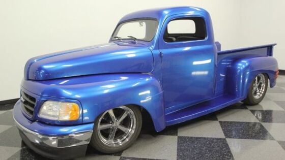 У пикапа Ford F-1 первого поколения много поклонников, но этот конкретный пример, мягко говоря, странный. Раритетное авто 1948 года выпуска модернизировали и продают по цене в 27 995 долларов. Причудливые изменения начинаются на передней части, которая отличается облицовкой гораздо более современной F-серии, которая не сочетается с выпуклым кузовом модели 1948 года. В эту новую переднюю часть входят другие фары, новая решетка радиатора и сделанный на заказ хромированный бампер. Владелец оснастил пикап комплектом 17-дюймовых легкосплавных дисков с черным глянцем и хромированными спицами. Дверные ручки и задние фонари сделали на заказ. Кузов выкрасили в специальный оттенок синего, который еще больше добавляет уникальности внешнему виду. Грузовик оснастили дистанционным открыванием дверей. Изменения продолжаются в салоне. Наиболее примечателен винил «морского класса» на сиденьях и нижних частях дверных панелей. Повсюду встречаются вставки из микрозамши и ковровое покрытие черного цвета. Также в салоне есть электрические стеклоподъемники, стерео AM / FM / CD и обновленная система кондиционирования воздуха. Также владелец оснастил грузовик красивым трехспицевым рулем. Хотя внешний вид не совсем со вкусом, нам очень нравится кабина. И последнее, но не менее важное, это двигатель. Под капотом находится 5,0-литровый атмосферный мотор V8. Он включает алюминиевый радиатор Griffin, коллекторы и двойную выхлопную систему X-pipe. Грузовик также имеет независимую переднюю подвеску, регулируемые койловеры, гидроусилитель руля, передние дисковые тормоза и четырехступенчатую автоматическую коробку передач. Читайте также о том, что Ford Thunderbird 1963-го года переделывали четыре года.