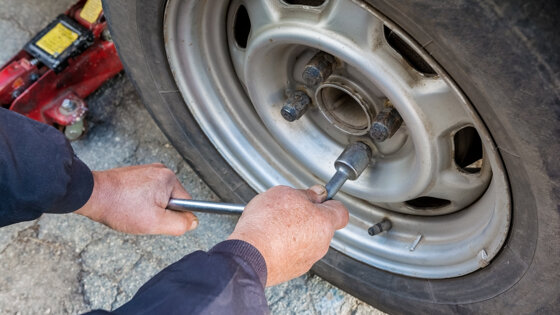 После этого, не поднимая автомобиль, ослабьте болты или гайки на колесе. Ведь если вы начнете откручивать колеса уже на вывешенной машине, вероятность того, что она сорвется с домкрата существенно увеличивается. С другой стороны, понятно, что ослабить болты - не значит открутить их совсем. Достаточно небольшого сдвига в полоборота.