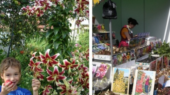 О существовании высоких лилий из класса ОТ-гибридов я писал в небольшой заметке в «Вестнике Цветовода» в сентябрьском номере (№18/110) 2008 года и поместил там фотографию своего внука рядом с такой лилией высотой 2,5 метра. Сорт не назвал специально, чтобы не воспользовались недобросовестные продавцы. Но они и без названия сорта хорошо использовали мою фотографию. На фото слева: внук рядом с лилией высотой 2,5 м. На фото справа: лотки продавцов с "чудо-лилиями", которые "выращены" при помощи фотошопа На Всероссийской цветочной выставке 4-8 мая 2010 года в Казани моя фотография, разрисованная с помощью компьютерных программ, была представлена на каждом стенде более чем двадцати залётных коробейников с посадочным материалом, не имеющих никаких опознавательных реквизитов. Но и этих чудо-картинок им показалось недостаточно, в приложении к ним они рассказывали сказки: «Сажать этих лилий надо не менее 10-15 штук в одну ямку, подвязывать их не надо — они сами завиваются друг за друга. И такими высокими они будут в первый же год посадки». Продавцы только успевали подносить и раскладывать по лоткам эти «чудо-лилии» (все луковицы из одного пакета и все одного цвета). На выставке были и другие «чудеса» селекции: азиатская лилия, скрещенная с орхидеей, восемь сортов махровых метельчатых флоксов любых расцветок, включая и жёлтый (Ян Вершхор отдыхает, и трудиться ему на поприще селекции флоксов совсем не обязательно — за него уже все сделано).