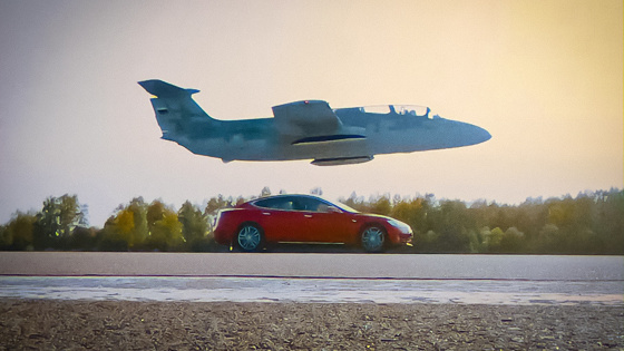Российские блогеры Алишер Панк и Сергей Валяев опубликовали в инстаграм-аккаунте Fastboompro видеозапись смертельно опасного трюка. Один из организаторов двигался по перекрытой взлетно-посадочной полосе аэропорта на Tesla Model S со скоростью 250 километров в час, в то время как над электрокаром вплотную летел реактивный самолет Л-29.