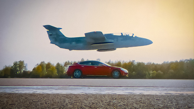 Россияне выполнили смертельно опасный трюк при помощи Tesla и реактивного самолета