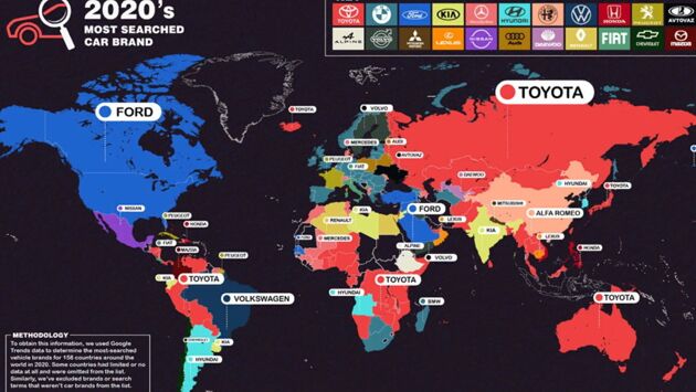 Граждане 55 государств планеты в поисковую строку браузера Google вводили Toyota. Баварская марка BMW лидирует в 34 странах, другой немецкий транспортный гигант - Mercedes - в 15. Следующими популярными модификациями стали KIA (7 государств), Ford (6), Volvo (5), Audi (5), Honda (4) и Nissan (4). Toyota чаще всего интересовала потребителей из России, Исландии, Австралии. Жители Украины в 2020 году активно интересовались машинами российской марки «АвтоВАЗ».