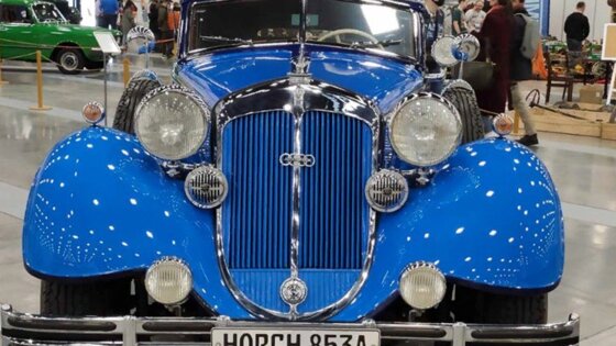 Модель 853A немецкий бренд Horch выпускал в 1935-1937 годах, поэтому представленный на мотор-шоу в Санкт-Петербурге кабриолет можно считать не только раритетным, но в принципе довольно редким. Отреставрированный автомобиль в первую очередь привлекает внимание гостей масштабного мероприятия ярко-синим цветом кузова, мягкой складной крышей и большим количеством сверкающих хромированных элементов в экстерьере.