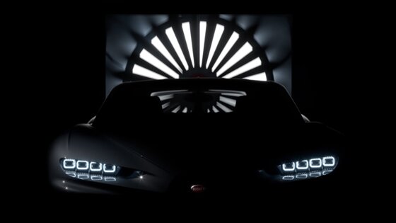 На фото представлен силуэт гиперкара с включенными фарами. Турбина на заднем плане намекает на то, что автомобиль находится в аэродинамической трубе для создания лучшего аэродинамического обвеса. Хотя на этой картинке нет никаких признаков серьезных изменений стиля.