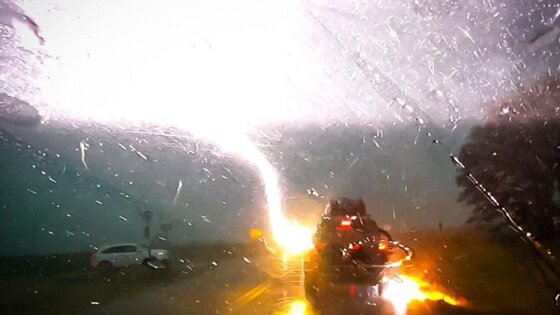 Примечательно, что автомобиль просто ехал по дороге, когда в него буквально за пару секунд четыре раза подряд бьет молния, полностью обесточивая транспортное средство. Позже стало известно, что в Jeep Grand Cherokee находилась супружеская пара с двумя детьми.