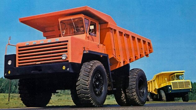 БелАЗ-540. Это не самый большой карьерный транспорт среди техники белорусского производства. Однако, на дорогах Москвы такая техника выглядела достаточно пугающе и необычно. Под капотом находилась дюжина цилиндров, а общий объем двигателя достигал 22,3 л. Грузоподъемность транспорта составляла 27 т. В конструкции производитель применил пневматическую подвеску, а максимальная скорость равнялась 55 км/час. Не трудно догадаться, какой расход был у этого гиганта – почти 100 литров на 100 км пути.
