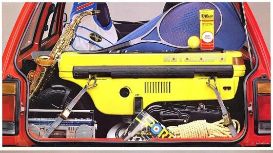 Мини-байк Motocompo в багажнике. В модели японского производства Honda City Turbo II, производителем предусмотрена возможность размещения в багажнике мотобайка. Маркетологи придумали такую конструкцию для людей, проживающих в оживленных мегаполисах. Идея состояла в том, чтобы офисные работники могли добраться на машине до центра города, оставить ее там на стоянке и продолжить путь на байке.