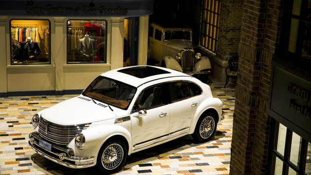 Концептуальной модели достались длинный капот, массивная решетка радиатора, круглая оптика и большое количество хрома, который присутствует во всех внешних элементах. Отсылки к ретро прослеживаются и внутри: в интерьере с минимумом острых углов имеются круглые дефлекторы воздуховодов и вышивка на дверях, а контрастируют с ними три современных дисплея.