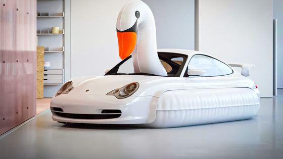 Автомобиль получил надувные бока, полностью закрывшие колесные диски, и гигантскую лебединую голову, которая высовывается из салона. Может ли такой Porsche держаться на воде, подобно плавучей птице, неизвестно (по крайней мере, на фотоматериалах он наделен такой способностью), но для езды он явно не предназначен. Porsche-лебедь отправится в тур по музеям и галереям, где на него можно будет посмотреть вживую.