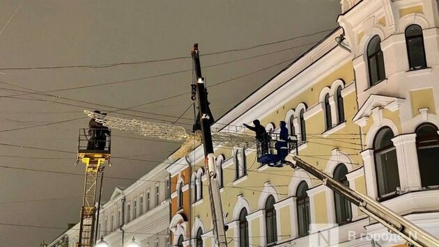 На главной улице вешают гирлянды, а ближе к площади Минина и Пожарского уже разместили светящуюся фигуру ангела. Для того, чтобы украсить Большой покровскую, потребовалось несколько машин с вышками.