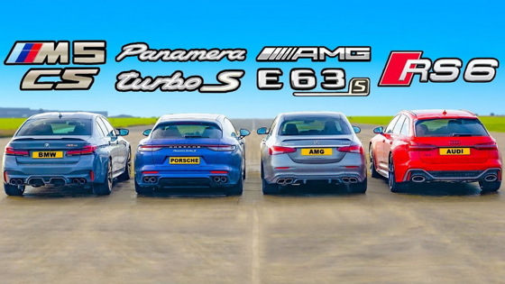 Британский YouTube-канал carwow устроил дрэг-гонку между BMW M5 CS, Audi RS 6 Avant, Mercedes-AMG E 63 S и Porsche Panamera Turbo S E-Hybrid Sport Turismo. Восьмицилиндровые полноприводные седаны и универсалы посоревновались в стартах с места на четверть мили, параллельных заездах с хода с 50 миль в час (80 км/ч) на полмили, а финальным испытанием была оценка эффективности тормозов со 100 миль в час (161 км/ч).