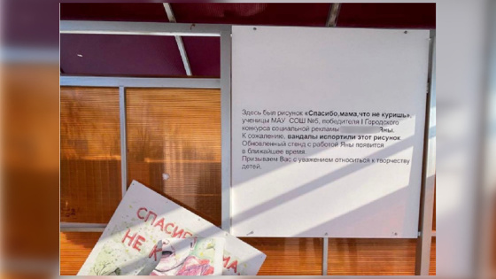 Сейчас вместо доброго плаката висит поучающая надпись: «Здесь был рисунок «Спасибо, мама, что не куришь» ученицы МАК СОШ № 5. К сожалению, вандалы испортили этот рисунок. Обновлённый стенд с работой Яны появится в ближайшее время. Призываем вас с уважением относиться к творчеству детей».