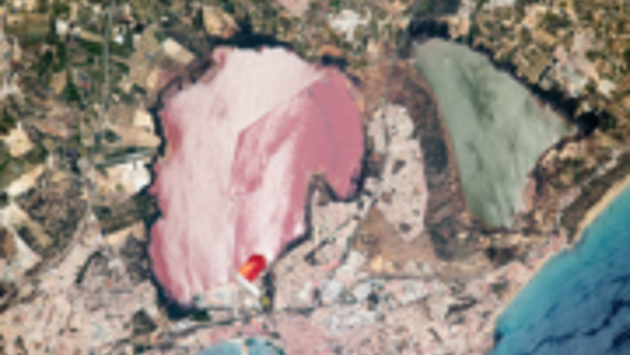 На фотографии юго-восточного побережья Испании, снятого с борта МКС, разноцветные водные среды выглядят словно краски на акварельной палитре. Портовый город Торревьеха окружают синее Средиземное море и две соленые лагуны — розовая Салада де Торревьеха и зеленая Салада де ла Мата.Салада де Торревьеха, которая больше по размеру, имеет чрезвычайно высокую соленость. Своим нежно-розовым оттенком она обязана одноклеточным водорослям Dunaliella salina, обитающим в соленых водоемах по всему миру. Возле южного берега этой лагуны расположен соляной завод. Ее соседка Салада де ла Мата менее соленая из-за стекающих в нее с соседних гор пресноводных потоков.Оба водоема ежегодно производят несколько сотен тонн соли, обеспечивая экономику региона. В прибрежных природных заповедниках живут местные и перелетные птицы, такие как большой фламинго, северная олуша и испанский воробей. Объекты охраняются Рамсарской конвенцией о водно-болотных угодьях международного значения.