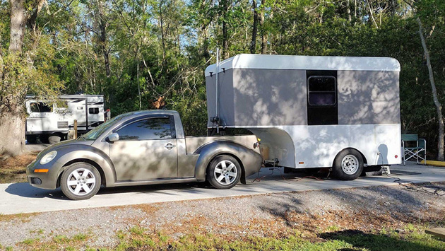 Компания Smyth Performance представила Volkswagen Beetle 2006 в виде компактного легкового грузовичка с небольшим кузовом вместо задних пассажирских кресел. Владельцу «Жука» такое решение показалось недостаточным, и в итоге небольшой эксклюзивный пикап превратился в автомобиль для кемпинга. Для этого водитель своими руками создал прицеп, который представляет собой небольшой дом на колесах. Внутри этого отсека находится кровать, которая буквально в одно движение может трансформироваться в удобный диван. Также там есть небольшой откидной стол и пара стульев. Еще присутствует кухонная зона с плитой и несколько полок для хранения вещей и посуды, пишет источник. $(function() { SyntaxHighlighter.all(); }); $(window).on('load', function(){ $('.flexslider').flexslider({ animation: "slide", start: function(slider) { $('body').removeClass('loading'); } }); }); Жилой отсек отапливаемый, и поэтому в нем не придется мёрзнуть зимой, а чтобы в машине было комфортно и летом – установлен кондиционер. Обе системы работают от штатного аккумулятора. Единственное, чего нахватает – это отсеков с питьевой водой. Изначально инженер планировал установить баки, но тогда машина была бы тяжелее установленных норм. База этого пикапа – стандартный Volkswagen Beetle 2006 года. Поэтому под капотом стоит старый немецкий 1.9-литровый атмосферный «движок», который работает в паре с механической коробкой передач. Этот дом на колесах потребляет всего 7.8 литров бензина на сто километров при условии, что средняя скорость будет не выше 110 км/час. Однако некоторые характеристики всё же были изменены – пришлось установить пневматические рессоры на заднюю ось, чтобы подвеска не получала большой нагрузки от прицепа. (function(w, d, n, s, t) { w[n] = w[n] || []; w[n].push(function() { Ya.Context.AdvManager.render({ blockId: "R-A-219559-6", renderTo: "yandex_rtb_R-A-219559-6", async: true }); }); t = d.getElementsByTagName("script")[0]; s = d.createElement("script"); s.type = "text/javascript"; s.src = "//an.yandex.ru/system/context.js"; s.async = true; t.parentNode.insertBefore(s, t); })(this, this.document, "yandexContextAsyncCallbacks"); Вам также будет интересно узнать: Ford назвал дату выхода электрофургона Tourneo Custom EV Volkswagen ID.Buzz с удлинённой колёсной базой замечен во время тестов Hyundai представил роскошный минивэн Staria Lounge Limousine