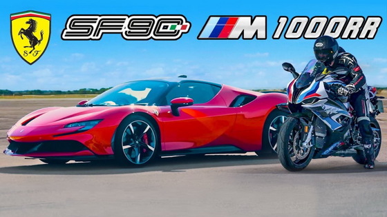 Британский YouTube-канал carwow устроил дрэг-гонку между быстрейшей серийной Ferrari — супергибридом SF90 Stradale — и супербайком BMW M 1000 RR. Победителя определили по итогам серии заездов с места на четверть мили, стартов с хода 30 и 50 миль в час (50 и 80 километров в час) на полмили, а финальным испытанием была оценка эффективности тормозных механизмов при замедлении со 100 миль в час (161 километр в час) до полной остановки.