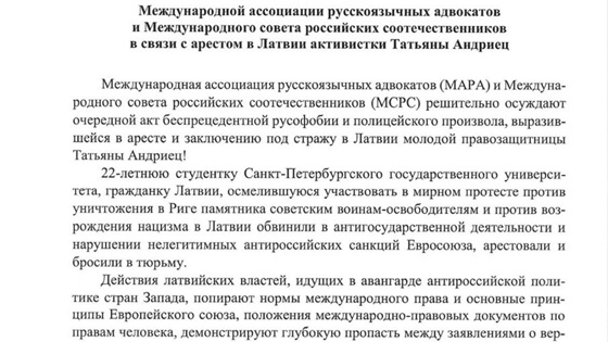 В понедельник Международная ассоциация русскоязычных адвокатов и Международный совет российских соотечественников опубликовали совместное заявление в связи с арестом в Латвии 22-летней студентки Татьяны Андриец. За то, что Татьяна имела смелость публично выразить свою гражданскую позицию в отношении сноса памятника советским воинами и выйти с плакатом против нарушения гражданских прав в Латвии, местные власти обвинили девушку в антигосударственной деятельности и нарушении санкций Евросоюза. После чего отправили ее за решетку на два месяца. В опубликованном в защиту Татьяны заявлении действия официальной Риги названы "актом беспрецедентной русофобии и полицейского произвола".