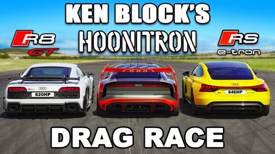 Британский YouTube-канал Сarwow свёл в дрэг-гонке три модели Audi. К привычным электромобилю RS e-tron GT и спорткару R8 GT с двигателем внутреннего сгорания на сей раз присоединился уникальный S1 Hoonitron, созданный в единственном экземпляре для «Джимханы» и Кена Блока — электромобиль стал последней машиной, на которой выступил американский гонщик. И впервые эксклюзивная модель поучаствовал в сравнительном тесте.