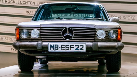 Но главный прорыв произошел ещё через год. Весной 1973-го на четвертой конференции в Киото был представлен Mercedes-Benz ESF 22, построенный на основе новейшего флагмана W116. Знатоки сразу отметят нестандартную переднюю часть, и будут правы: её позаимствовали у модели SL R107. Всё дело в решетке радиатора: она у SL не такая монументальная, меньше выдается вперед, а значит — потенциально не столь травмоопасна для пешеходов.