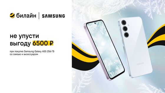 «Топим лёд» в билайне: выбирай Samsung Galaxy A55 256 ГБ с выгодой 6500 рублей в комплекте со связью и аксессуаром