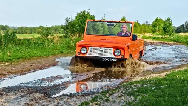 ЛуАЗ‑969А – противоречивый и неповторимый.Езда по полям и лесным проселкам на этой машине сродни игре. Мотор оглушительно стрекочет и постоянно норовит перегреться. Гремит всё, что неплотно пригнано. Чтобы не слететь с узенького сидения, на ухабах надо покрепче держаться за руль. Однако скачки и прыжки, к которым ЛуАЗ относится с юношеским азартом, вызывают у меня улыбку. Но ведь я просто катаюсь в свое удовольствие. А кто-то использовал такую машину как повседневный транспорт – и в этом случае ощущения от автомобиля были, конечно, несколько другими. Начальная военная подготовка Это ж надо! Десятилетие проектировать компактный полноприводный внедорожник, чтобы выпустить его… переднеприводным! Похоже на анекдот, но это вполне реальная история. Автомобиль конструировали в НАМИ с середины 50‑х годов, потом к этому делу подключили Запорожский автомобильный завод, поскольку по узлам и агрегатам внедорожник максимально унифицировали с ЗАЗ‑965. В первую очередь занимались так называемым транспортером переднего края (ТПК), предназначенным для армии. И такую машину – ЛуАЗ‑967 – сделали. Однако досталось и гражданским, причем мирный ЛуАЗ пошел в производство гораздо раньше военного – в 1966 году. Но – переднеприводным и под именем ЛуАЗ‑969В (временный). Луцкий машиностроительный завод, занимавшийся прежде рефрижераторными установками, совсем не был готов к производству сложных узлов полноприводной трансмиссии. ЛуАЗ‑969В стал первым в СССР серийным переднеприводным автомобилем, но одновременно – историческим и инженерным курьезом. Время временной версии кончилось лишь в 1971 году, когда завод сделал уже около 7,5 тысяч моноприводных машин. Тогда начали выпуск полноценного, с полным приводом, ЛуАЗ‑969 – правда, пока еще с мотором объемом 0,9 л и мощностью 30 л. с. В 1975 году машину модернизировали, и она получила имя ЛуАЗ‑969А. Именно с таким автомобилем мне и посчастливилось пообщаться тет-а‑тет. ПОПЛЫЛИ Близкий родственник нашего героя – плавающий транспортер переднего края ЛуАЗ‑967М. В серию автомобиль запустили в 1975 году с двигателем V4 рабочим объемом 1,2 л мощностью 37 л. с. Максимальная скорость – 75 км/ч, на плаву – 3–4 км/ч. Печки-лавочки Именно в 1977 году, когда из ворот Луцкого завода выехал этот автомобиль, на советские экраны вышел детский фильм режиссера Тамары Лисициан «Волшебный голос Джельсомино». В картине, снятой по книге Джанни Родари, полицейские в Стране Лжецов катаются по городской площади на таких же, причем даже и точно такого же рыжего цвета, ЛуАЗах. Думаю, не все зрители тогда знали, что это за диковинные машинки. К слову, в тот год завод построил чуть больше 8,5 тысяч машин. А в первые годы производства луцкие внедорожники продавали только в европейской части России, в Беларуси, Украине и Молдавии – ведь завод был не в состоянии обеспечить всю страну запасными частями. Но у тех, кто знакомился с этим автомобильчиком близко, было немало поводов для удивления. Под капотом угловатого кузова, нарисованного с помощью линейки и угольника, стоит знакомый запорожский воздушного охлаждения двигатель V4. Только здесь он установлен спереди, да еще и развернут на 180 градусов. Коробка передач, соответственно, тоже расположена задом наперед, и передачи (как и на части Запорожцев) включаются зеркально: первая – влево и на себя. Продолжение 