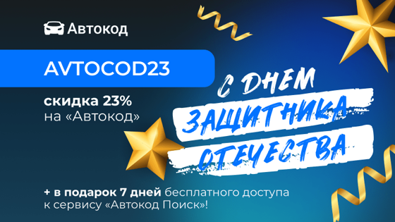 В честь самого брутального праздника года дарим вам промокод AVTOCOD23*. С ним сможете проверить авто со скидкой 23%. А после проверки получите неделю бесплатного доступа к агрегатору «Автокод Поиск» и найдете машину мечты еще быстрее.