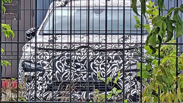 На снимке автомобиль размером примерно с Hyundai Creta стоит за забором в плотной маскировочной черно-белой расцветке.