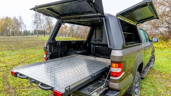 В списке заводского дополнительного оборудования для пикапа Huanghai N7 есть кунг и лебедка – и несмотря на большое количество суровых «допов», проблем с регистрацией быть не должно. Помимо штатного кунга для грузового отсека также сертифицирована выезжающая платформа, рассчитанная на 650 кг.