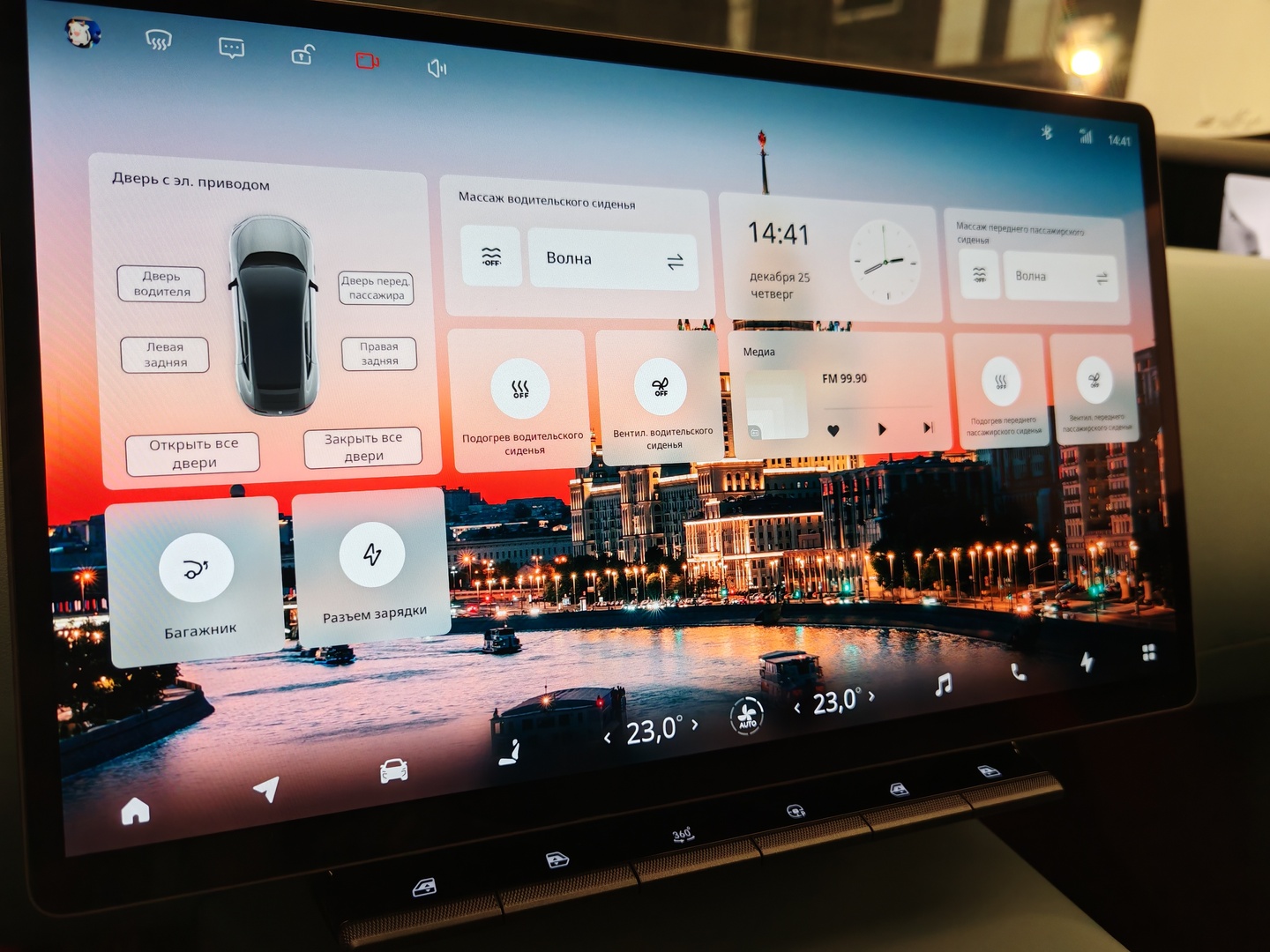Особое внимание здесь уделено сиденьям: здесь есть функция Zero Gravity, все кресла имеют подогрев, вентиляцию и массаж, передним положены оттоманки с электроприводом. В компании отметили, что при движении подставку для ног водителя убирать необязательно.