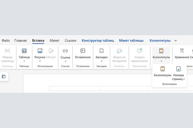 1. Нажмите «Вставка» и выберите раздел «Колонтитулы».
