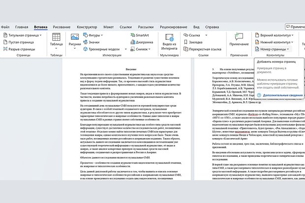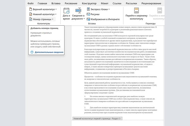 1. Нажмите на вкладку «Вставка» и кликните на «Колонтитулы». Выберите «Номер страницы» в открывшемся меню.