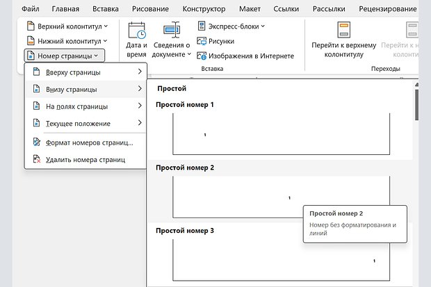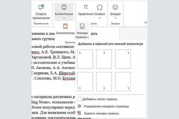 2. Выберите, как именно хотите расположить нумерацию. Word Online предлагает не так много вариантов, как офлайн-приложение, но выбор все же есть. Цифры можно разместить сверху или снизу текста справа, слева или по центру относительно колонтитула.
