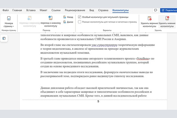 Удалить номер с первой страницы в данном случае можно через «Колонтитулы».