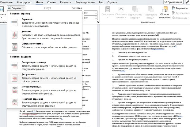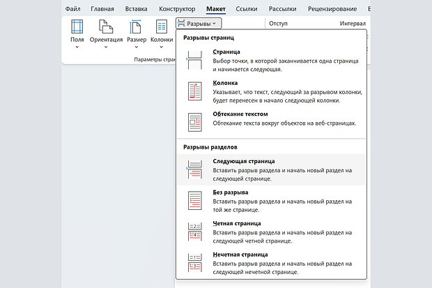 1. Поместите курсор перед началом следующего раздела и в разделе «Макет» нажмите «Разрыв разделов», а затем «Следующая страница».