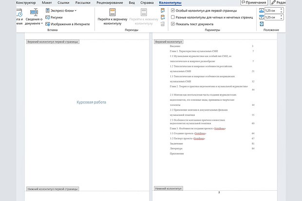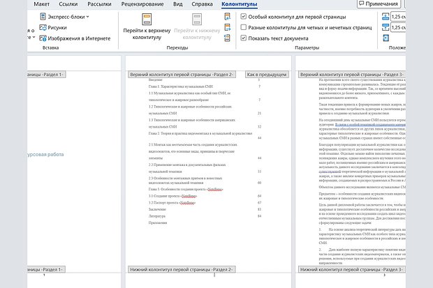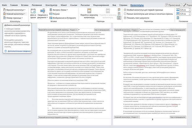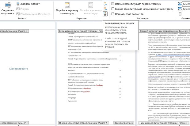 3. Дважды кликните левой кнопкой мыши по номеру страницы внутри раздела, чтобы открыть «Колонтитулы». Убедитесь, что у параметра «Как в предыдущем разделе» нет галочки.