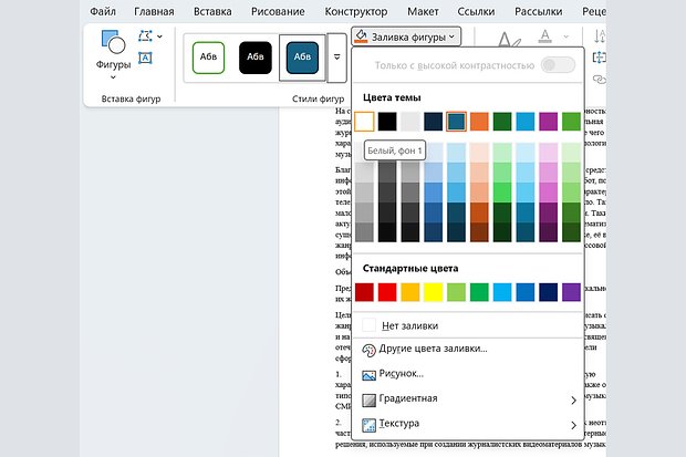 4. Нажмите на фигуру, чтобы в верхней панели открылись параметры ее настройки. Кликните на «Заливка фигуры» и выберите белый цвет, который будет сливаться с оттенком страницы.