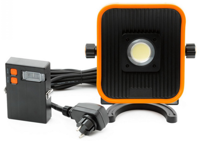 Светодиодный прожектор выполнен в корпусе с защитой IK08/IP54 и оснащен магнитным держателем для крепления на металлических поверхностях. Модель имеет гибридное питание: может работать от встроенного литийионного аккумулятора емкостью 8,8 А·ч либо от сети через съемный кабель длиной 5 м. Источник света — один COB-светодиод мощностью 50 Вт, обеспечивающий световой поток 5000 лм.